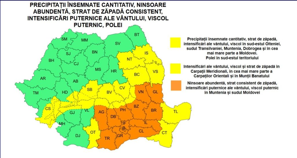 ANM a anunțat și un COD PORTOCALIU de viscol și ninsori abundente (în special pentru estul/sud-estul Munteniei și sudul Moldovei), cu strat consistent (până la 20–50 cm) și rafale de 60–85 km/h; cele mai mari viteze ale vântului sunt prognozate în județe precum Vrancea, Galați, Buzău, Brăila, Ialomița și Călărași.