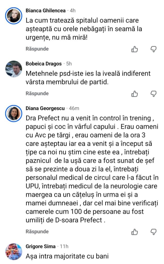 Cel mai puternic mesaj e un comentariu lung și plin de amănunte. Se spune clar: „prefectul nu a venit în control”. Și descrie o scenă care, dacă se confirmă, e de noaptea minții: la UPU erau oameni cu suspiciune de AVC pe tărgi, erau pacienți care așteptau „de la ora 3”, iar prefecta ar fi intrat și ar fi început să țipe, pe motiv că lumea „nu știe cine e ea”, asta după ce s-a băgat în față tuturor fără pic de jenă.