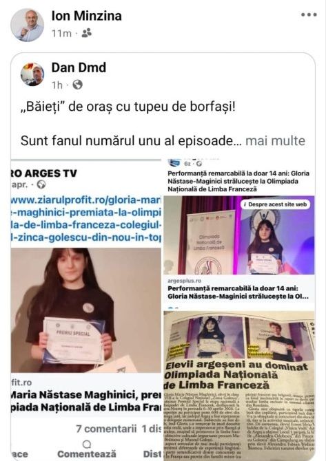 Este vorba despre Gloria Maria Năstase Maghinici, adolescenta despre care presa locală a scris apreciativ după câștigarea unui premiu special. În loc de felicitări, fata a fost ironizată într-o postare de pe Facebook, iar lucrurile au căpătat o gravitate și mai mare în momentul în care, potrivit capturilor de ecran publicate de familie, mesajul a fost distribuit chiar de președintele Consiliului Județean Argeș, Ion Mînzînă.